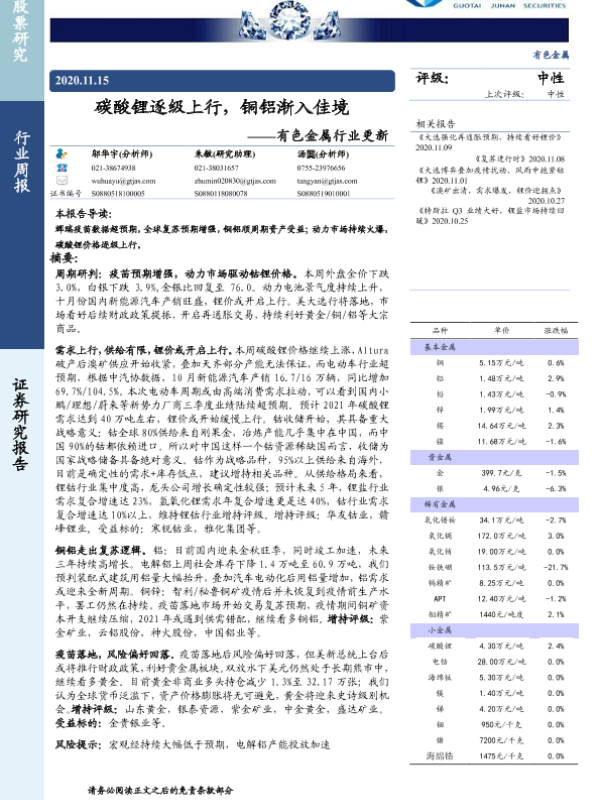 【国泰君安证券】【20201115】20201115-国泰君安-有色金属行业更新:碳酸锂逐级上行,铜铝渐入佳境-14页