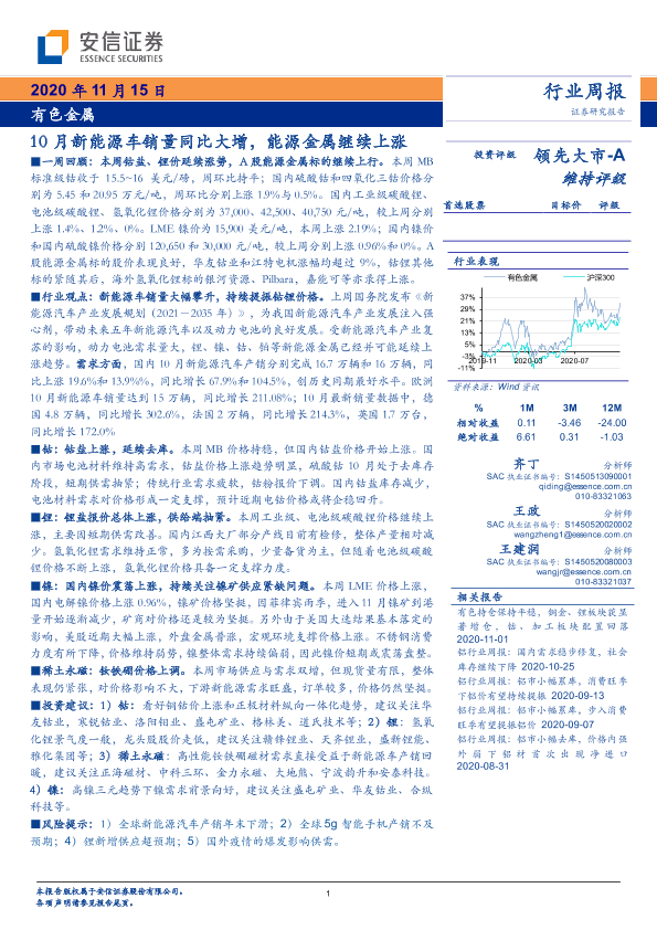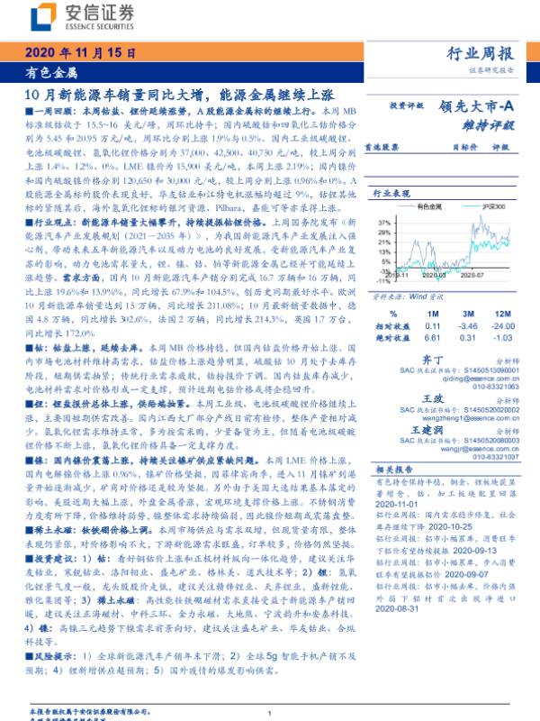 【安信证券】【20201115】20201115-安信证券-有色金属行业周报:10月新能源车销量同比大增,能源金属继续上涨-26页