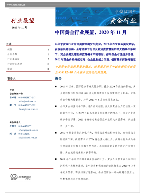 【中诚信国际】【202011】中国黄金行业展望,2020年11月-2页