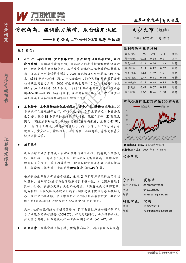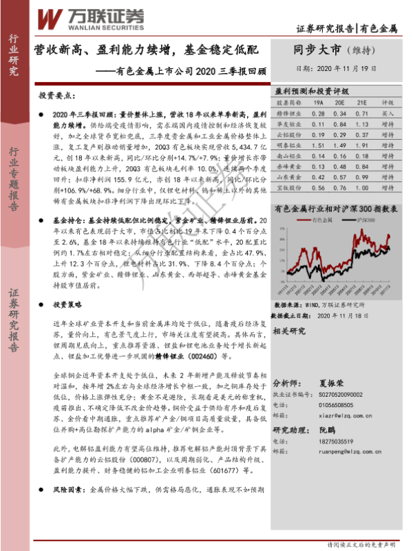 【万联证券】【20201119】20201119-万联证券-有色金属上市公司2020三季报回顾:营收新高、盈利能力续增,基金稳定低配-16页