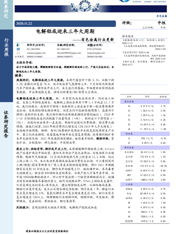 【国泰君安证券】【20201122】20201122-国泰君安-有色金属行业更新:电解铝或迎来三年大周期-13页