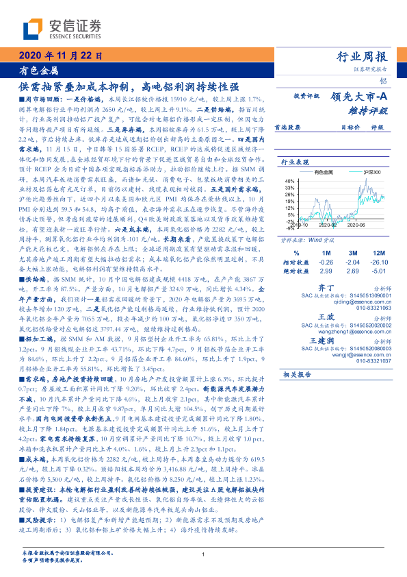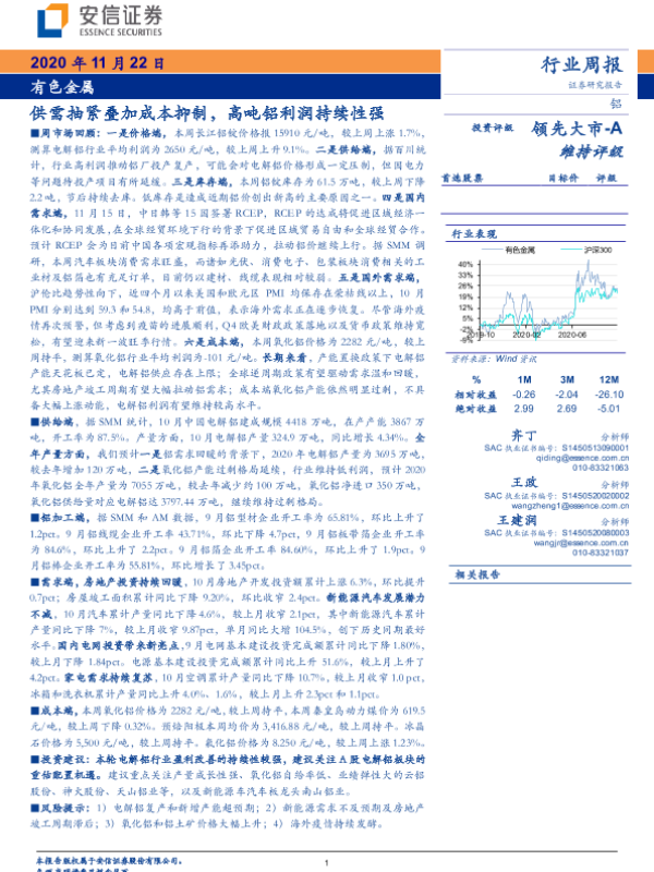 【安信证券】【20201122】20201122-安信证券-有色金属行业周报:供需抽紧叠加成本抑制,高吨铝利润持续性强-23页