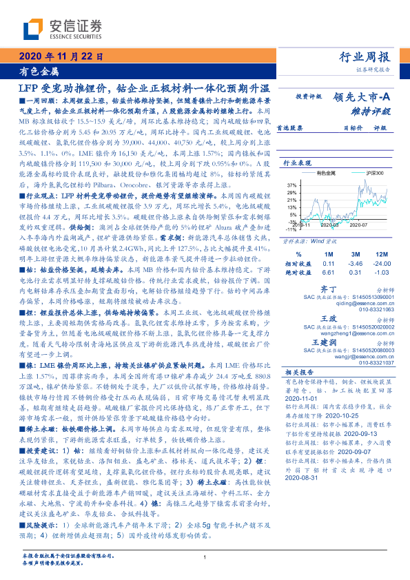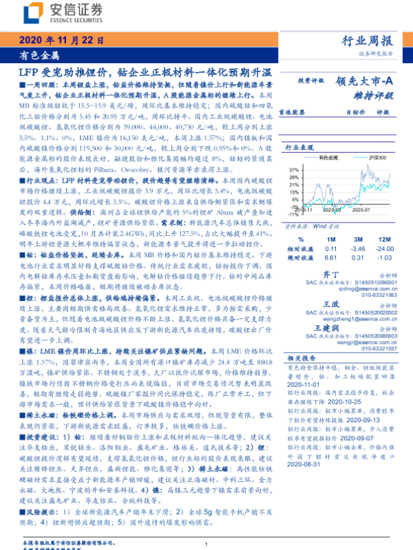【安信证券】【20201122】20201122-安信证券-有色金属行业周报:LFP受宠助推锂价,钴企业正极材料一体化预期升温-27页
