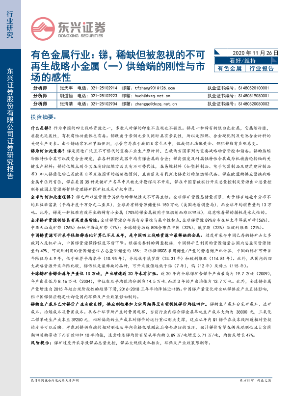 【东兴证券】【20201126】有色金属行业:锑,稀缺但被忽视的不可再生战略小金属(一)供给端的刚性与市场的感性-16页