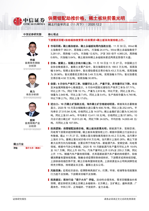 【中信证券】【20201202】稀土行业半月谈(11月下):供需错配助推价格,稀土板块前景光明-33页