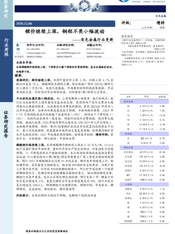 【国泰君安证券】【20201206】20201206-国泰君安-有色金属行业更新:锂价继续上涨,铜铝不畏小幅波动-13页