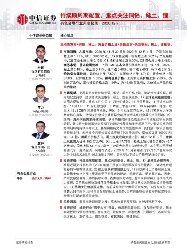 【中信证券】【20201207】20201207-中信证券-有色金属行业周度聚焦:持续顺周期配置,重点关注铜铝、稀土、锂-18页
