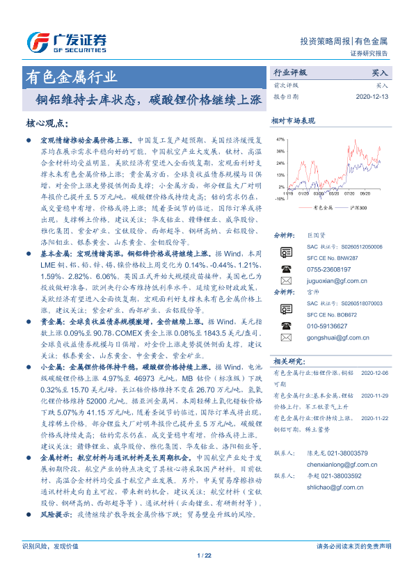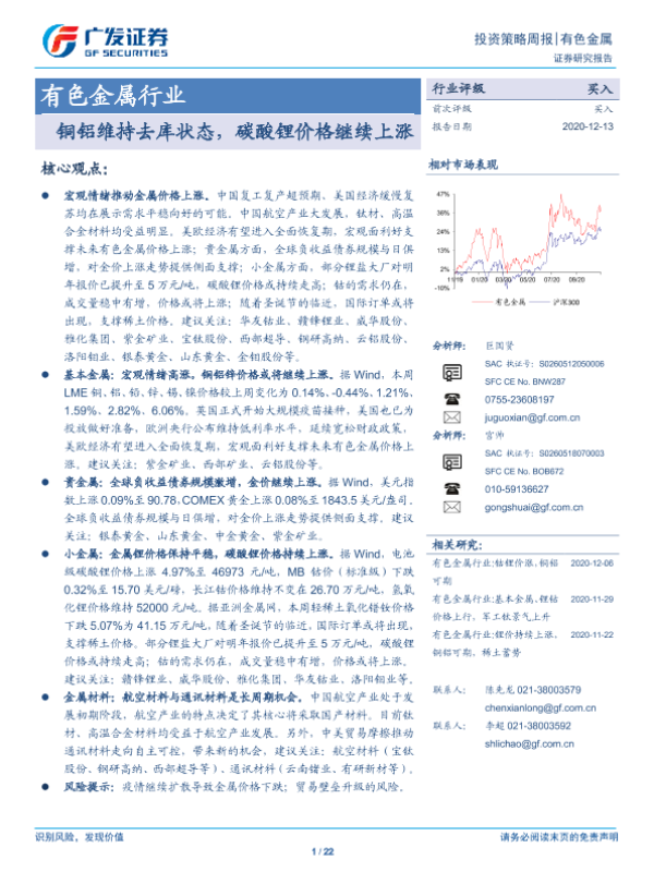 【广发证券】【20201213】20201213-广发证券-有色金属行业投资策略周报:铜铝维持去库状态,碳酸锂价格继续上涨-22页