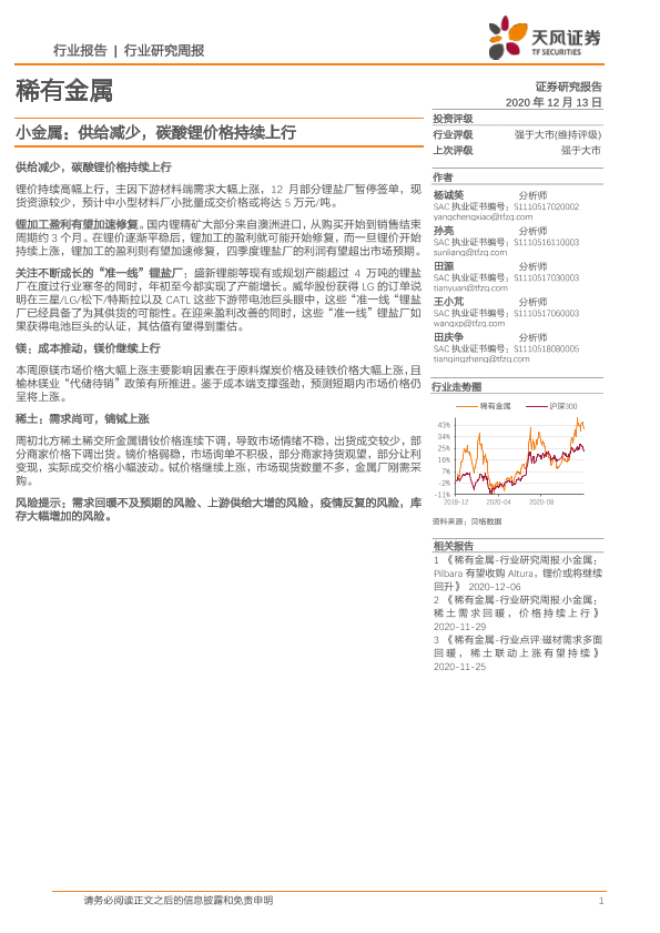 【天风证券】【20201213】20201213-天风证券-稀有金属行业研究周报:小金属:供给减少,碳酸锂价格持续上行-16页