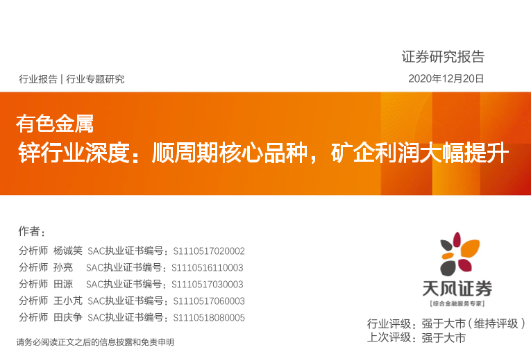 【天风证券】【20201220】有色金属:锌行业深度:顺周期核心品种,矿企利润大幅提升-21页