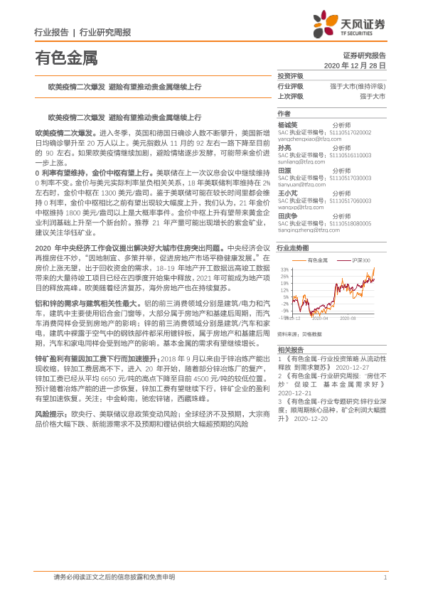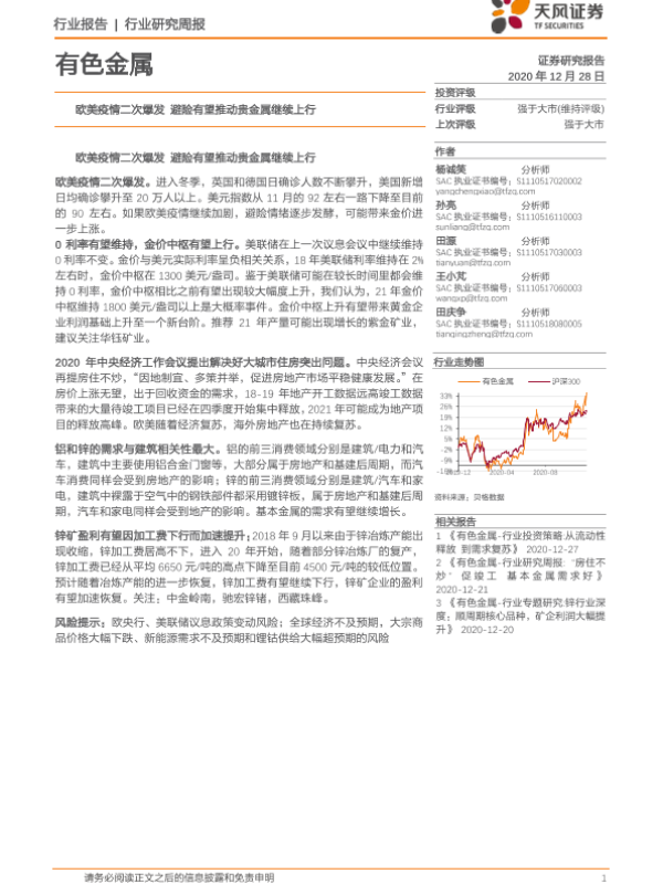 【天风证券】【20201228】有色金属行业:欧美疫情二次爆发 避险有望推动贵金属继续上行-12页