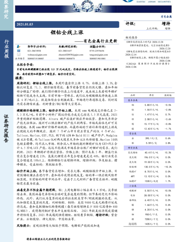 【国泰君安证券】【20210103】锂钴全线上涨——有色金属行业更新-13页