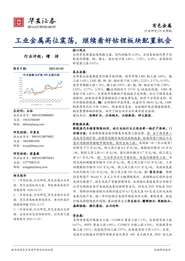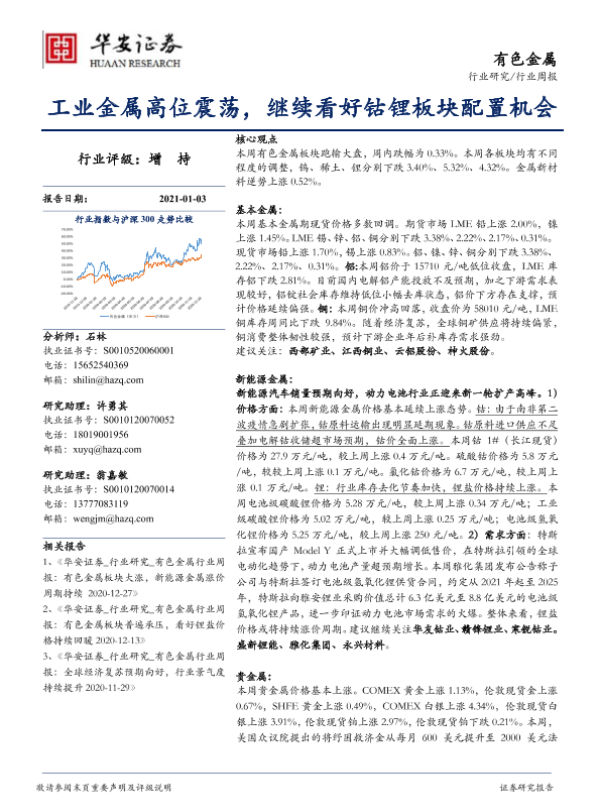 【华安证券】【20210103】20210103-华安证券-有色金属行业周报:工业金属高位震荡,继续看好钴锂板块配置机会-16页