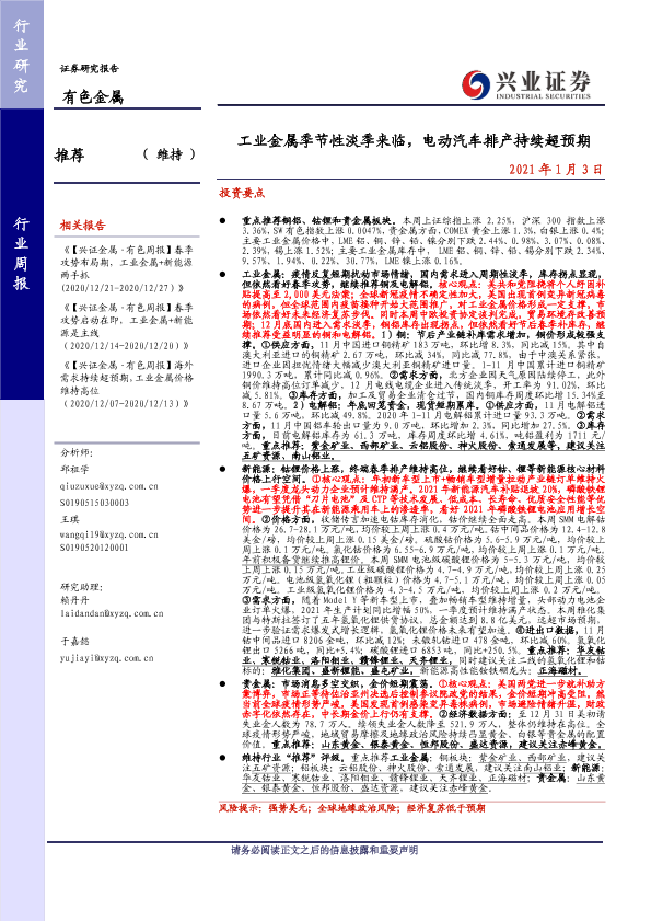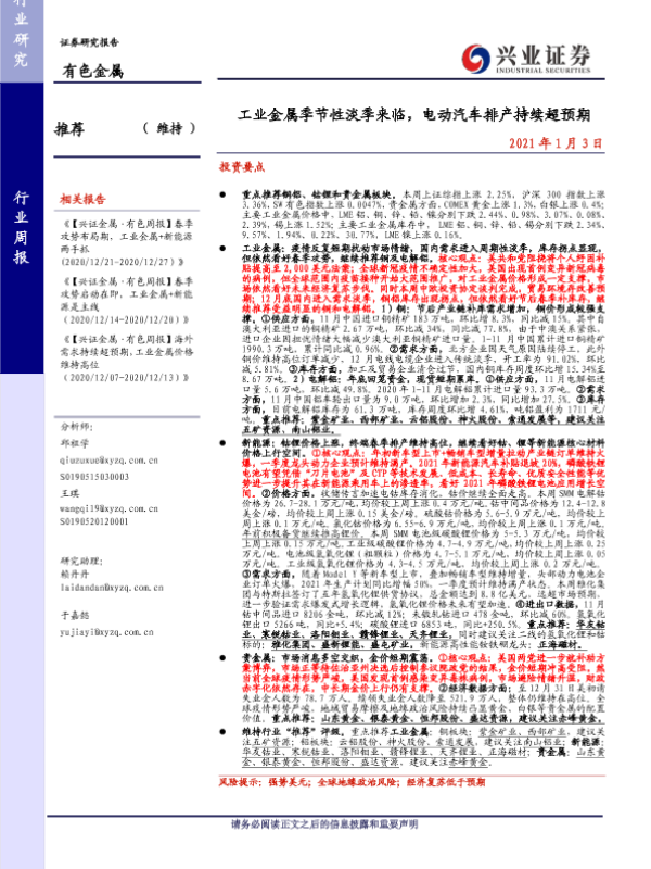 【兴业证券】【20210103】20210103-兴业证券-有色金属行业周报:工业金属季节性淡季来临,电动汽车排产持续超预期-22页