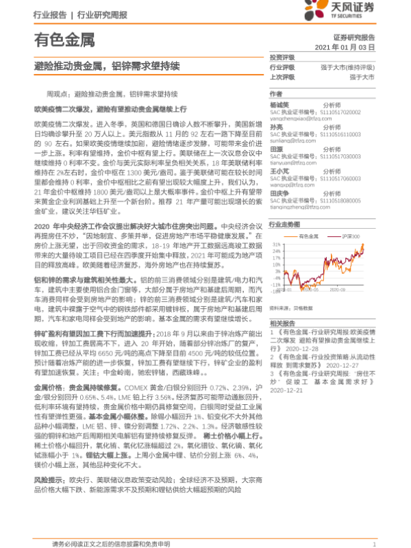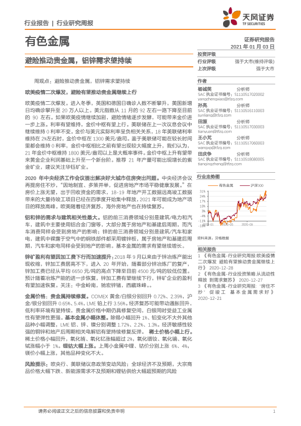 【天风证券】【20210103】有色金属行业:避险推动贵金属,铝锌需求望持续-12页