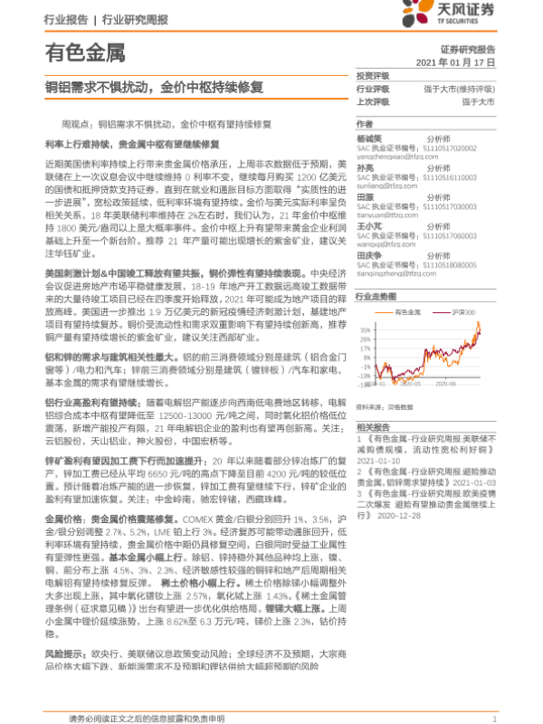【天风证券】【20210117】20210117-天风证券-有色金属行业研究周报:铜铝需求不惧扰动,金价中枢持续修复-11页