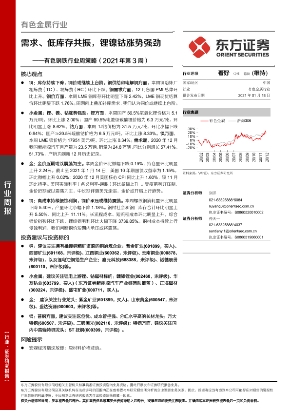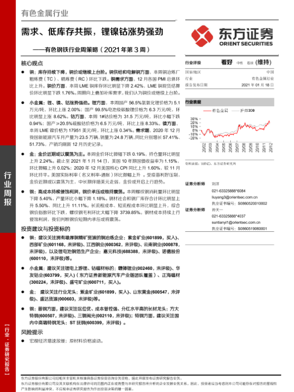 【东方证券】【20210118】20210118-东方证券-有色钢铁行业周策略(2021年第3周):需求、低库存共振,锂镍钴涨势强劲-29页