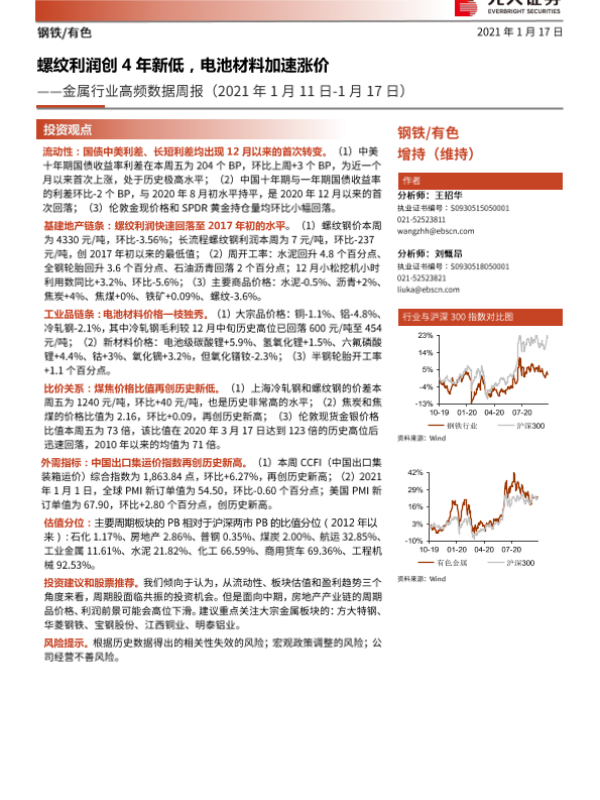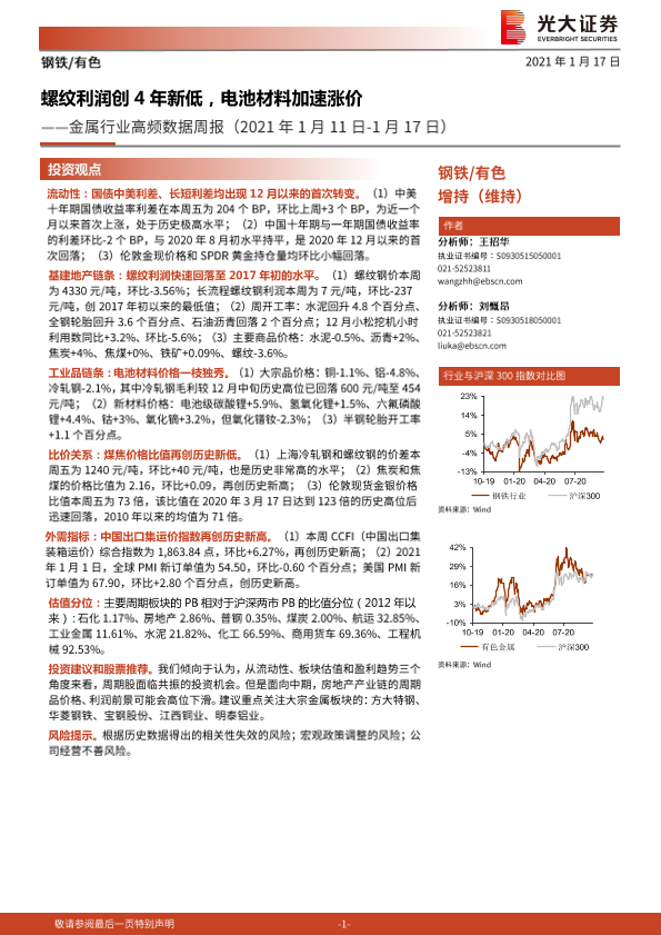 【光大证券】【20210117】金属行业高频数据周报:螺纹利润创4年新低,电池材料加速涨价-17页
