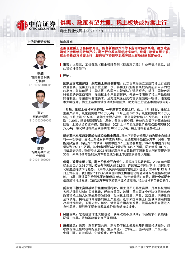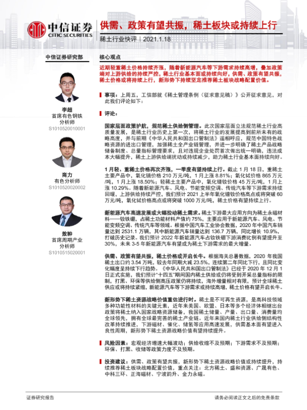 【中信证券】【20210118】稀土行业快评:供需、政策有望共振,稀土板块或持续上行-2页