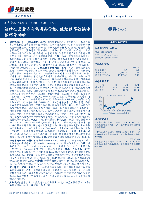 【华创证券】【20210124】20210124-华创证券-有色金属行业周报:继续全面看多有色商品价格,继续推荐锂镍钴铜铝等标的-21页