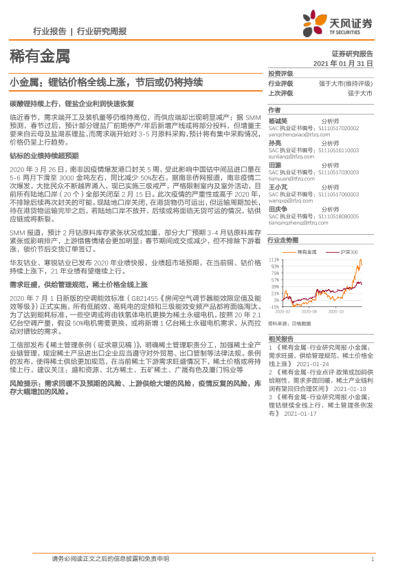 【天风证券】【20210131】20210131-天风证券-稀有金属行业:小金属:锂钴价格全线上涨,节后或仍将持续-16页