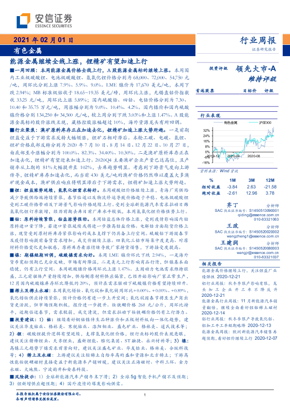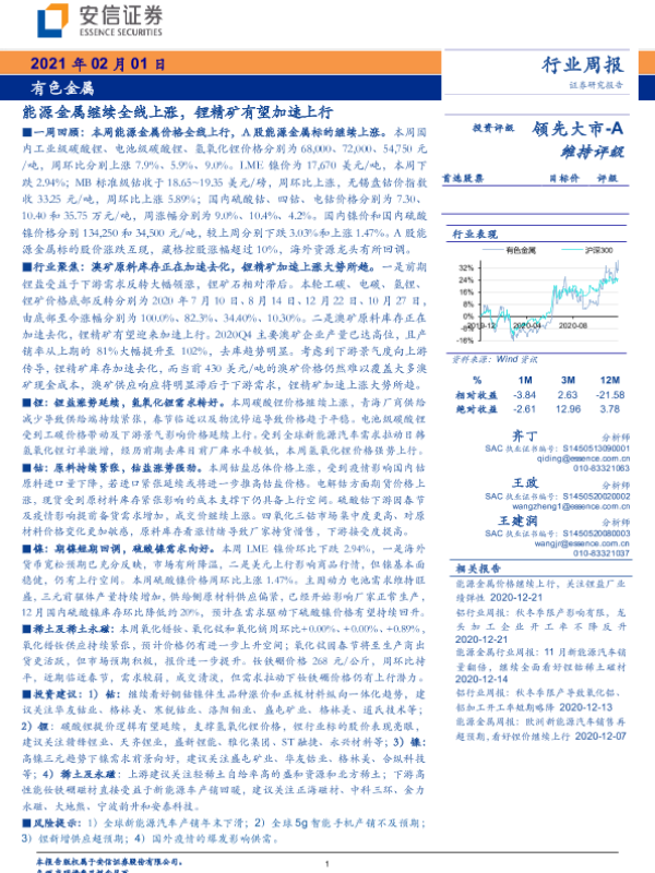 【安信证券】【20210201】20210201-安信证券-有色金属行业周报:能源金属继续全线上涨,锂精矿有望加速上行-26页