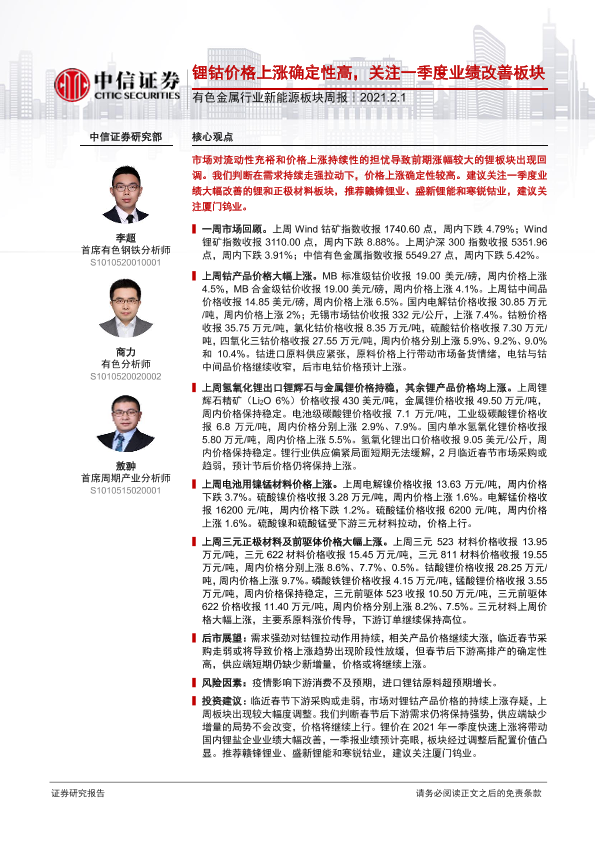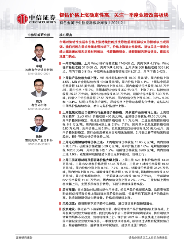 【中信证券】【20210201】20210201-中信证券-有色金属行业新能源板块周报:锂钴价格上涨确定性高,关注一季度业绩改善板块-16页