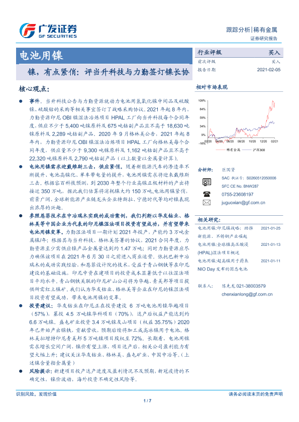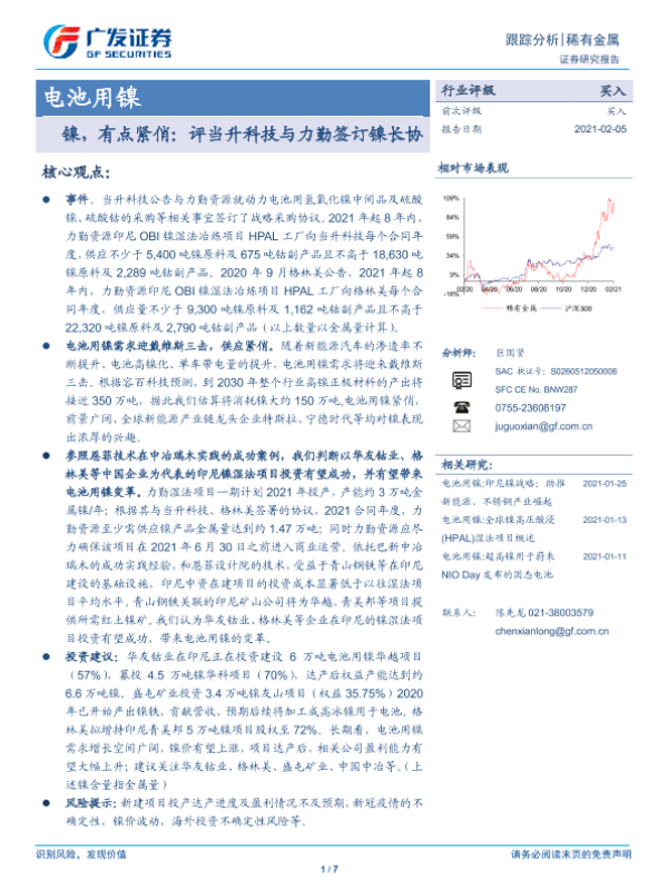 【广发证券】【20210205】稀有金属电池用镍:镍,有点紧俏:评当升科技与力勤签订镍长协-7页