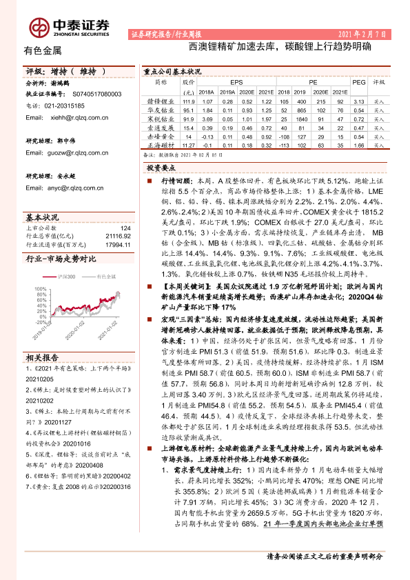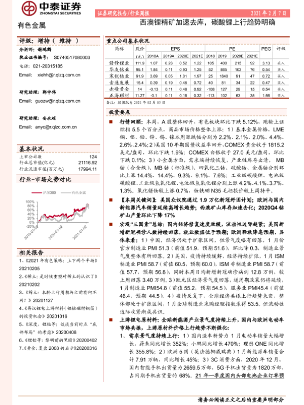 【中泰证券】【20210207】20210207-中泰证券-有色金属行业周报:西澳锂精矿加速去库,碳酸锂上行趋势明确-41页