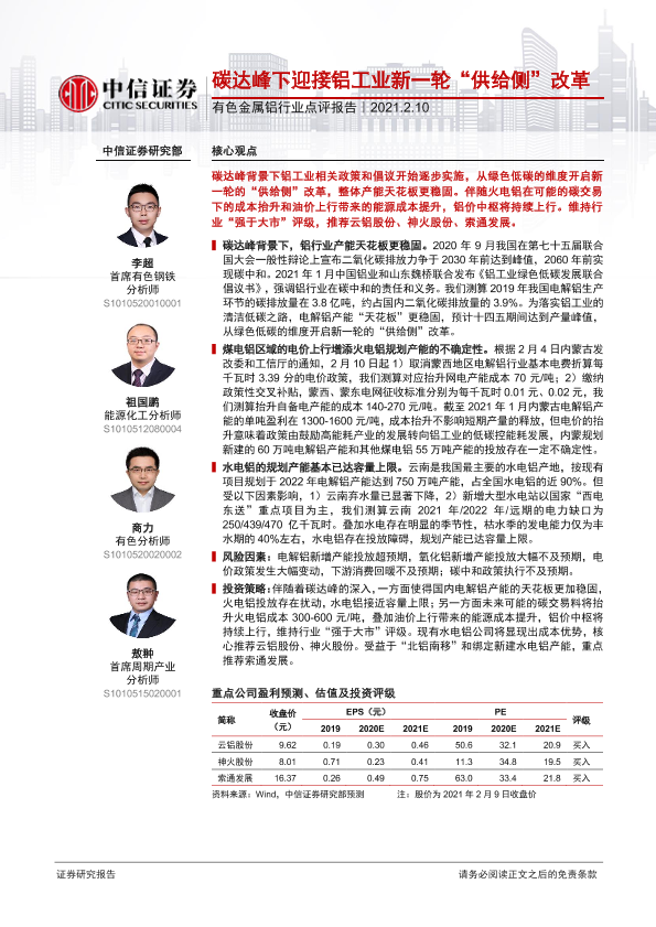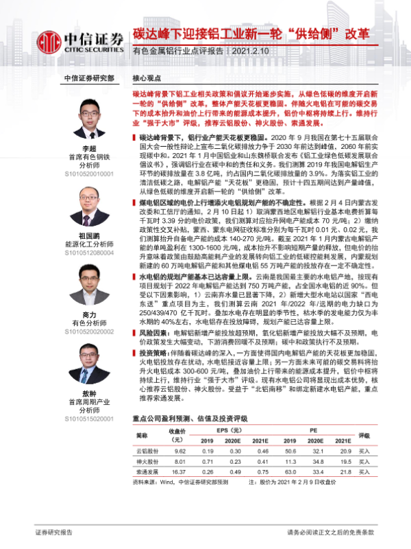 【中信证券】【20210210】20210210-中信证券-有色金属铝行业点评报告:碳达峰下迎接铝工业新一轮“供给侧”改革-2页