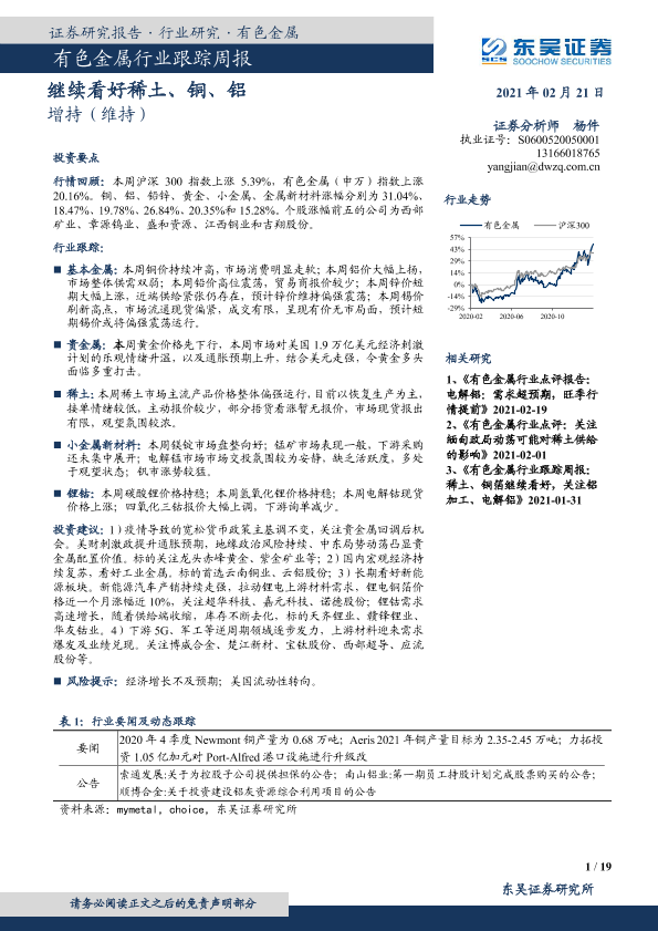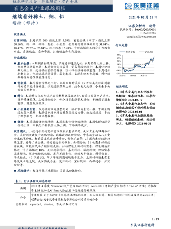 【东吴证券】【20210221】20210221-东吴证券-有色金属行业跟踪周报:继续看好稀土、铜、铝-19页