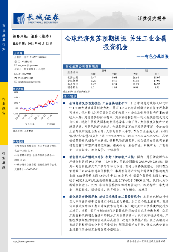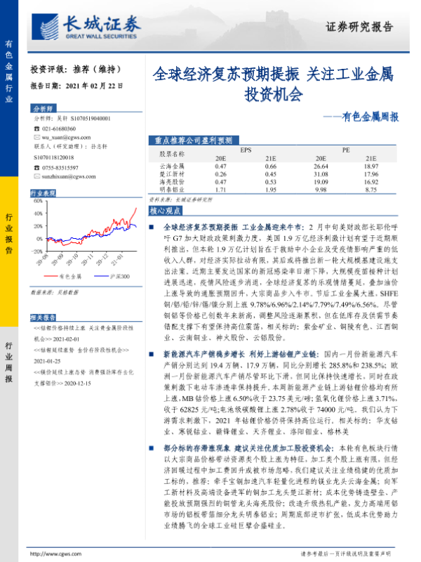 【长城证券】【20210222】20210222-长城证券-有色金属周报:全球经济复苏预期提振 关注工业金属投资机会-12页