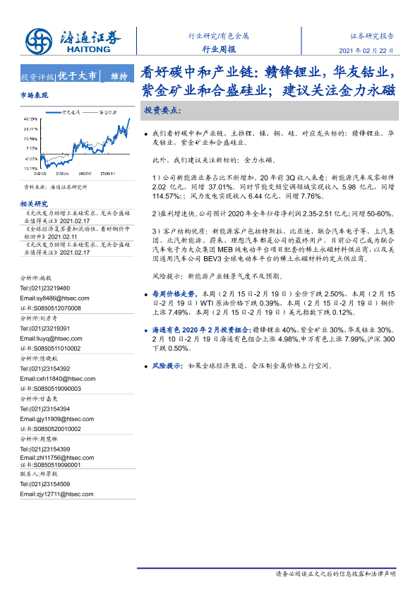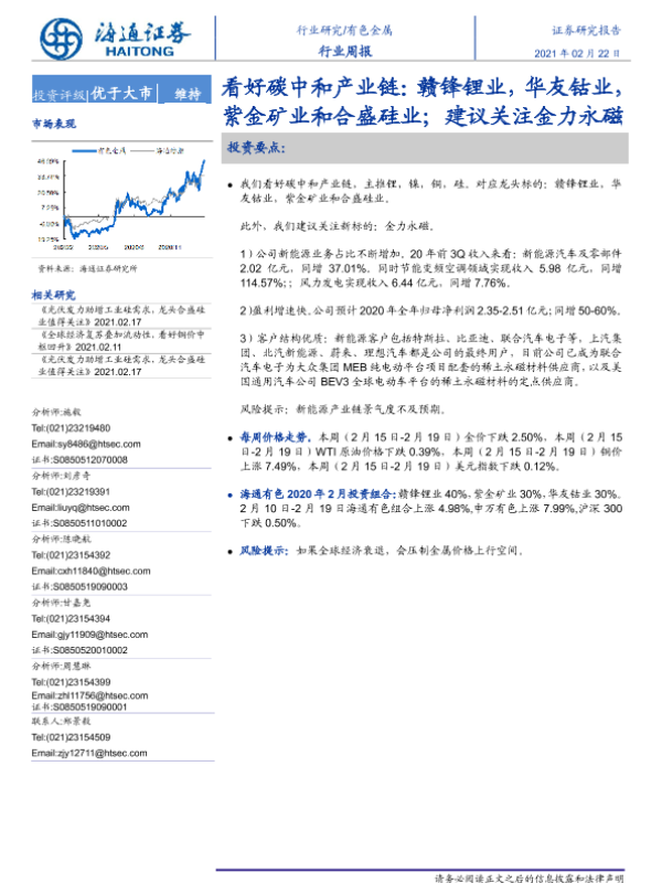 【海通证券】【20210222】20210222-海通证券-有色金属行业周报:看好碳中和产业链:赣锋锂业,华友钴业,紫金矿业和合盛硅业;建议关注金力永磁-5页