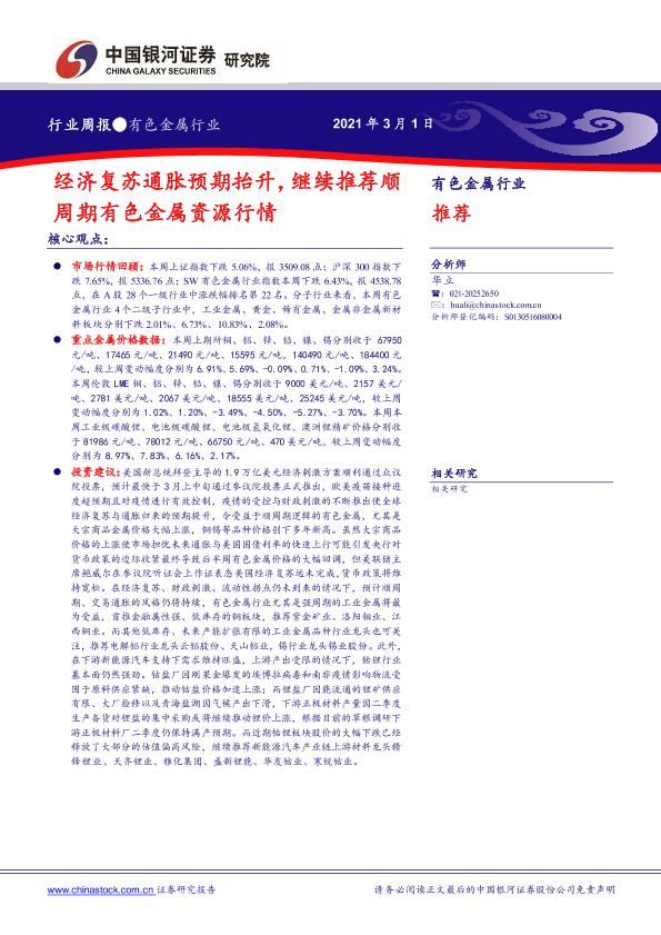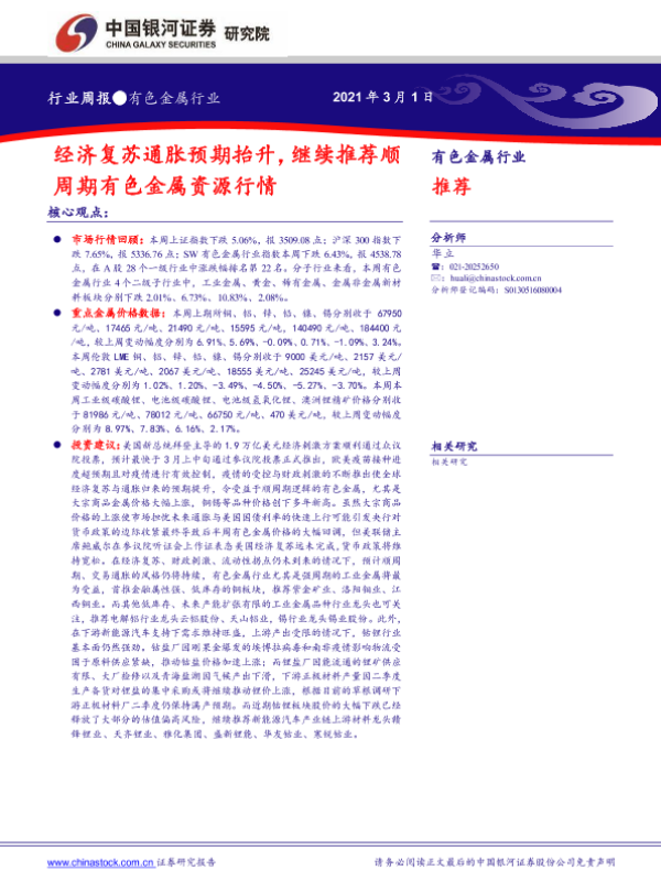 【银河证券】【20210301】中国银河-有色金属行业周报:经济复苏通胀预期抬升,继续推荐顺周期有色金属资源行情-19页