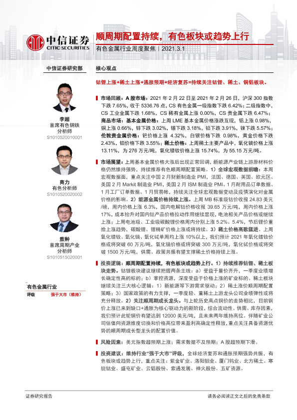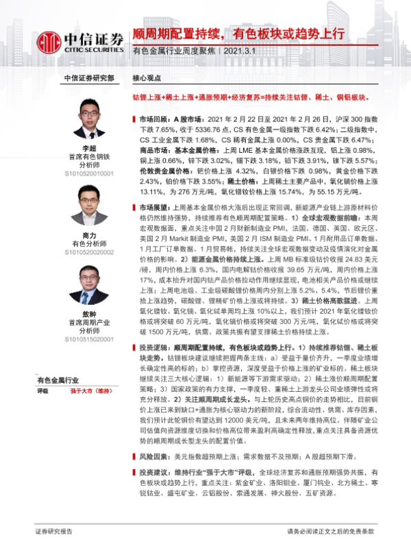 【中信证券】【20210301】20210301-中信证券-有色金属行业周度聚焦:顺周期配置持续,有色板块或趋势上行-17页
