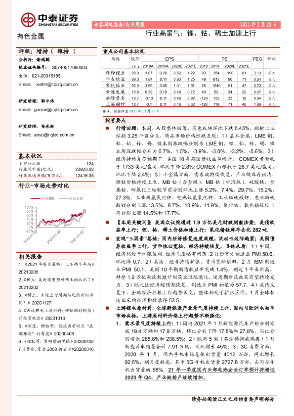 【中泰证券】【20210228】有色金属行业高景气:锂、钴、稀土加速上行-40页
