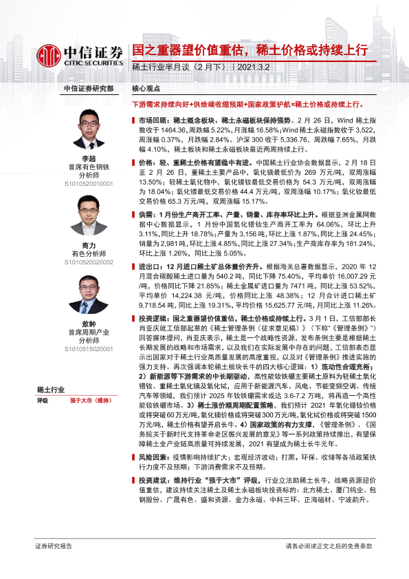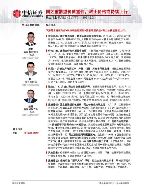 【中信证券】【20210302】稀土行业半月谈(2月下):国之重器望价值重估,稀土价格或持续上行-33页