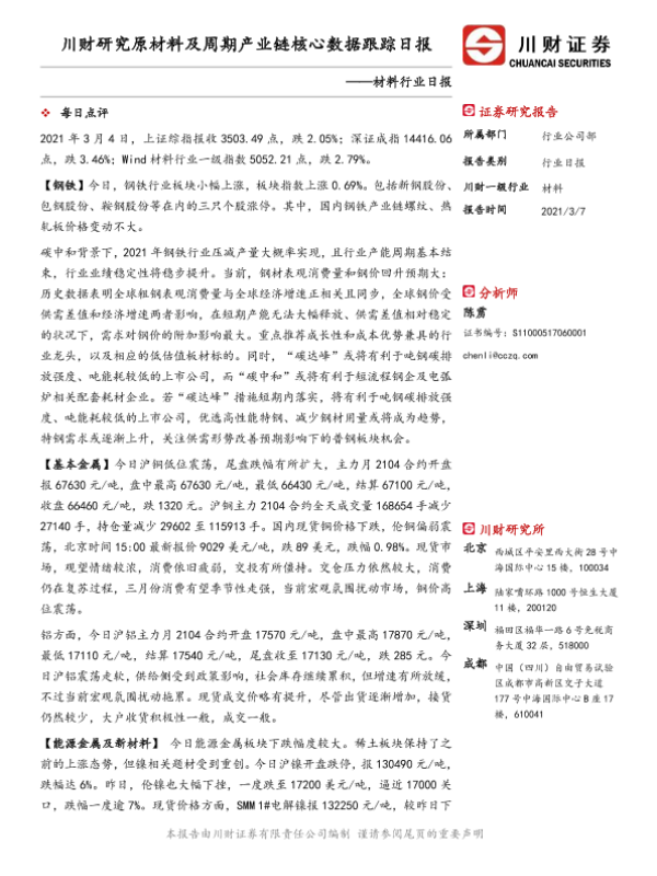【川财证券】【20210307】材料行业日报:川财研究原材料及周期产业链核心数据跟踪日报-4页