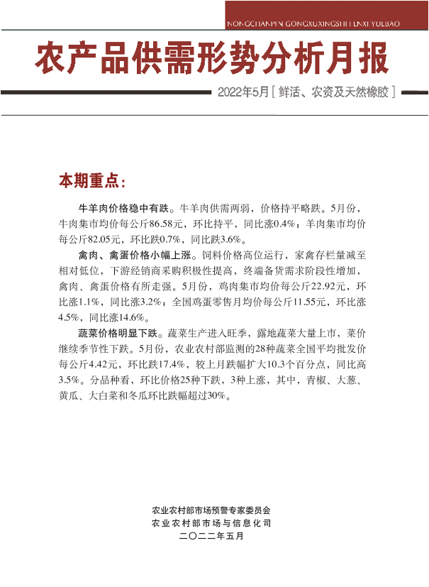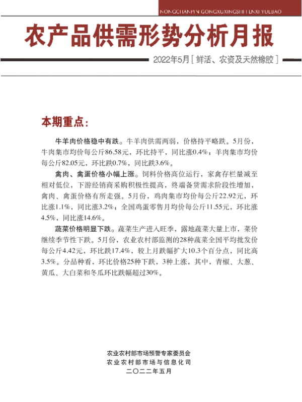 【农业农村部市场预警专家委员会】【202205】2022年5月鲜活农产品供需形势分析月报-33页