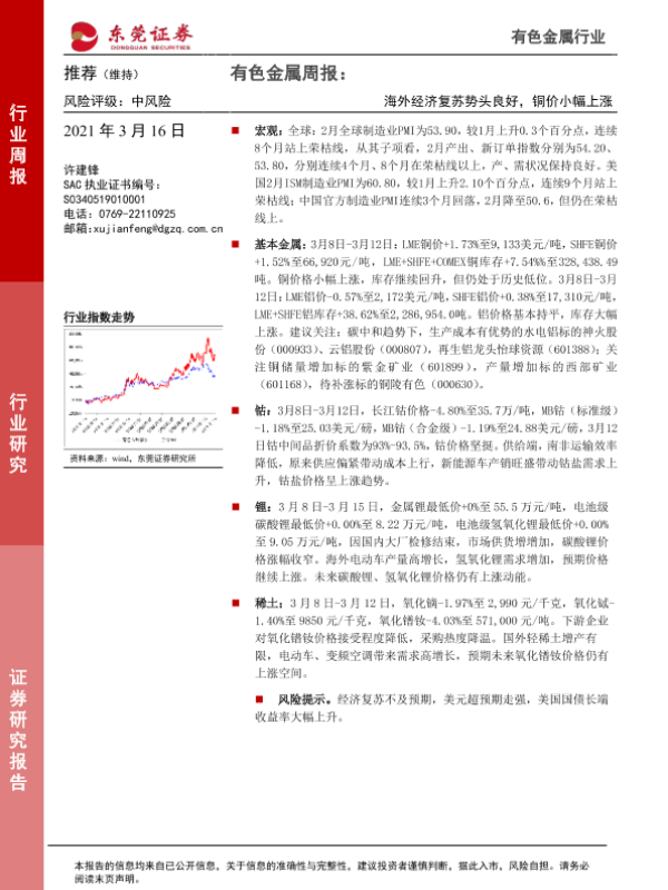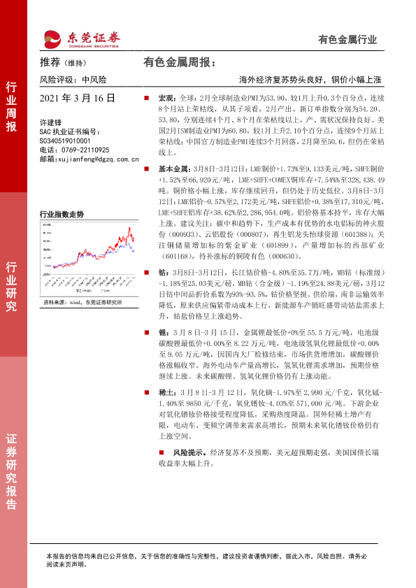 【东莞证券】【20210316】东莞证券-有色金属周报:海外经济复苏势头良好,铜价小幅上涨-27页