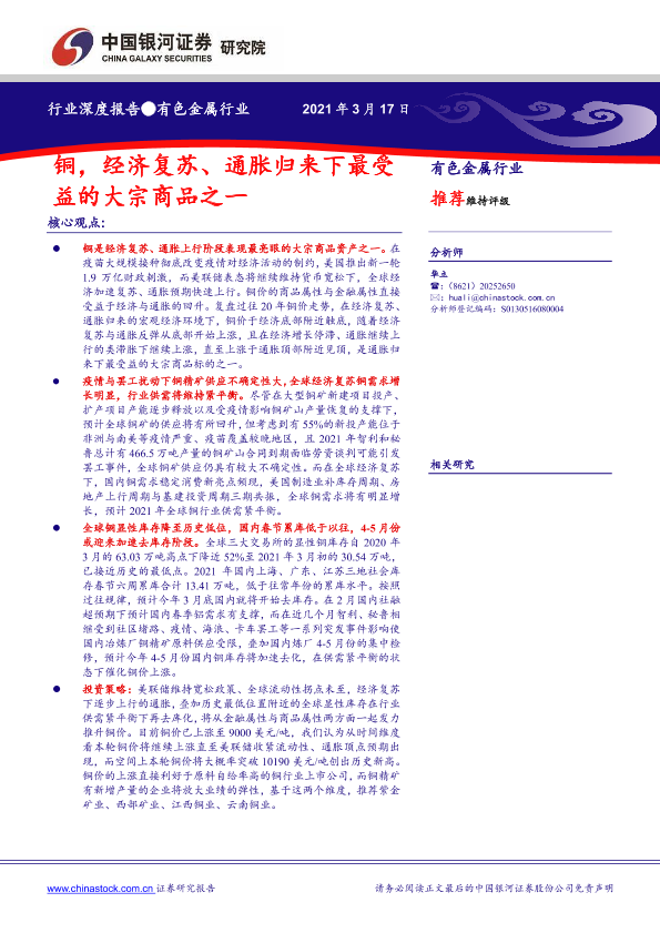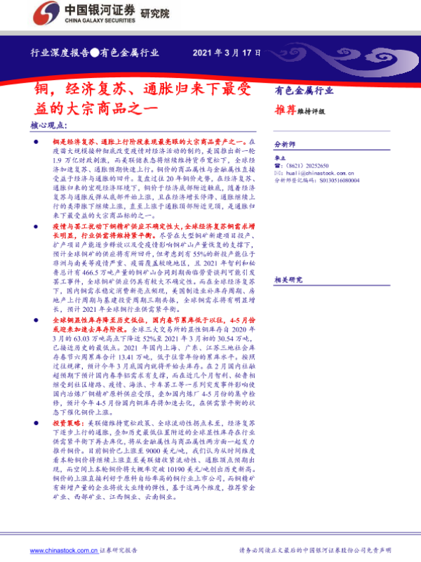【银河证券】【20210317】有色金属行业深度报告:铜,经济复苏、通胀归来下最受益的大宗商品之一-28页