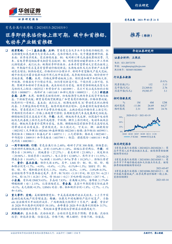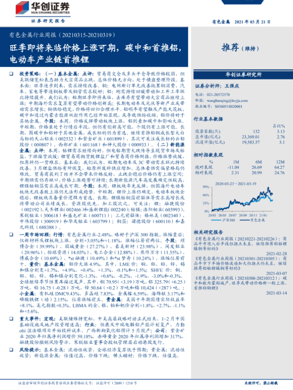 【华创证券】【20210321】20210321-华创证券-有色金属行业周报:旺季即将来临价格上涨可期,碳中和首推铝,电动车产业链首推锂-18页