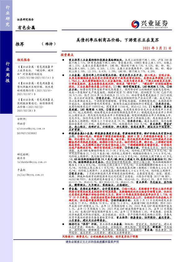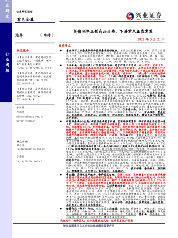 【兴业证券】【20210321】20210321-兴业证券-有色金属行业周报:美债利率压制商品价格,下游需求正在复苏-22页