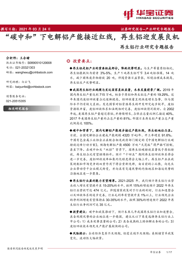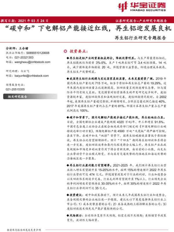 【华宝证券】【20210324】“碳中和”下电解铝产能接近红线,再生铝迎发展良机-17页
