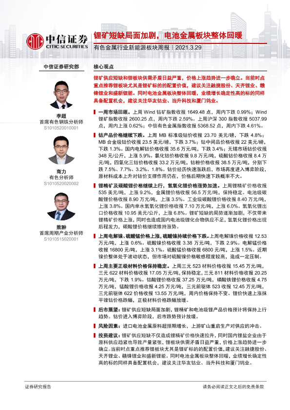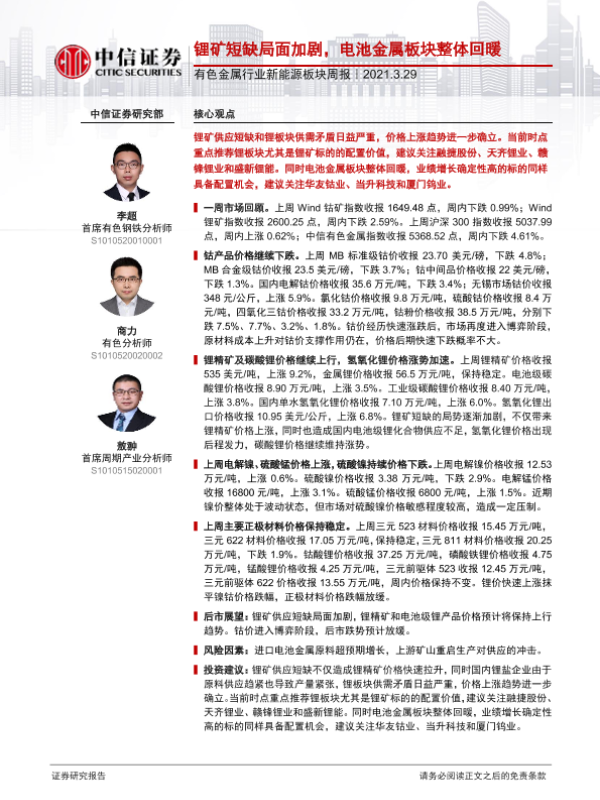 【中信证券】【20210329】有色金属行业新能源板块周报:锂矿短缺局面加剧,电池金属板块整体回暖-16页