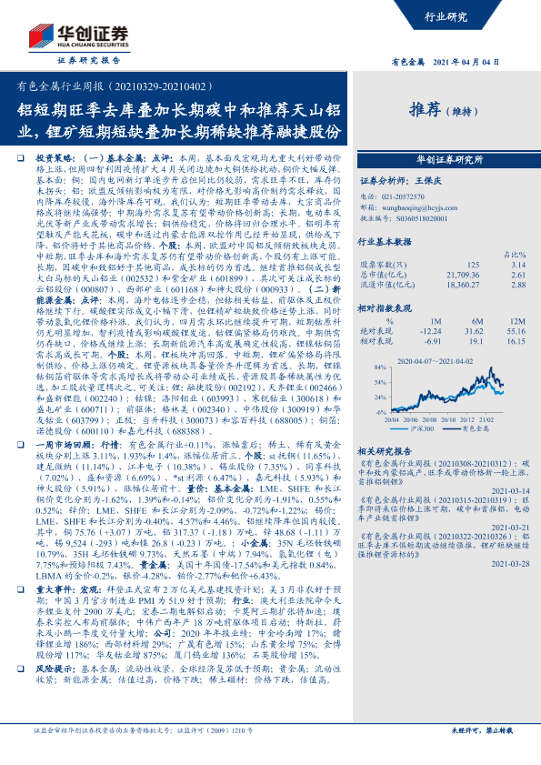 【华创证券】【20210404】20210404-华创证券-有色金属行业周报:铝短期旺季去库叠加长期碳中和推荐天山铝业,锂矿短期短缺叠加长期稀缺推荐融捷股份-20页