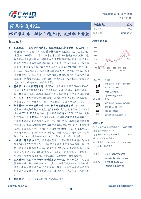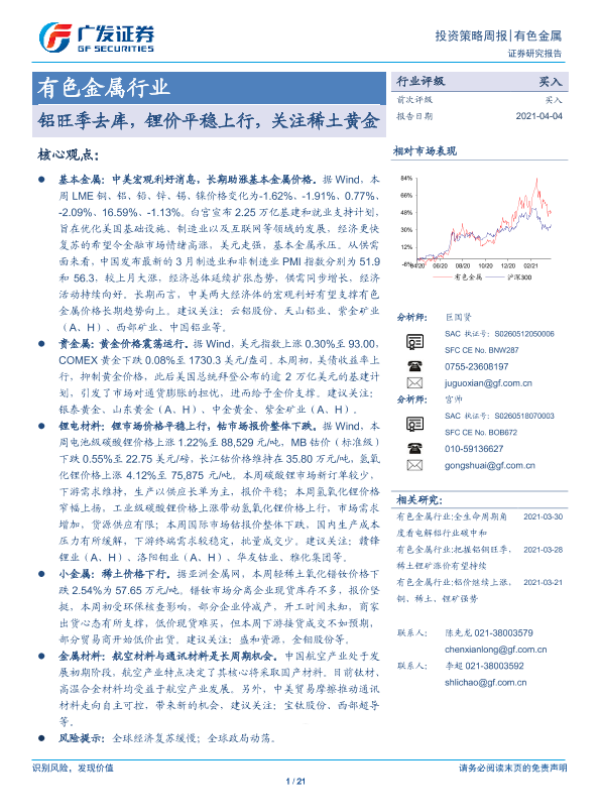 【广发证券】【20210404】20210404-广发证券-有色金属行业投资策略周报:铝旺季去库,锂价平稳上行,关注稀土黄金-21页
