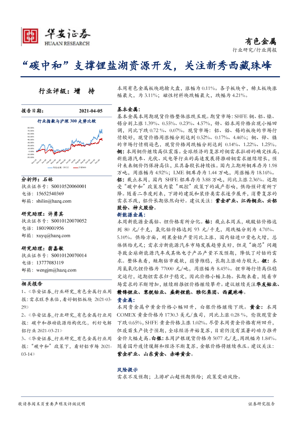 【华安证券】【20210405】20210405-华安证券-有色金属行业周报:“碳中和”支撑锂盐湖资源开发,关注新秀西藏珠峰-12页