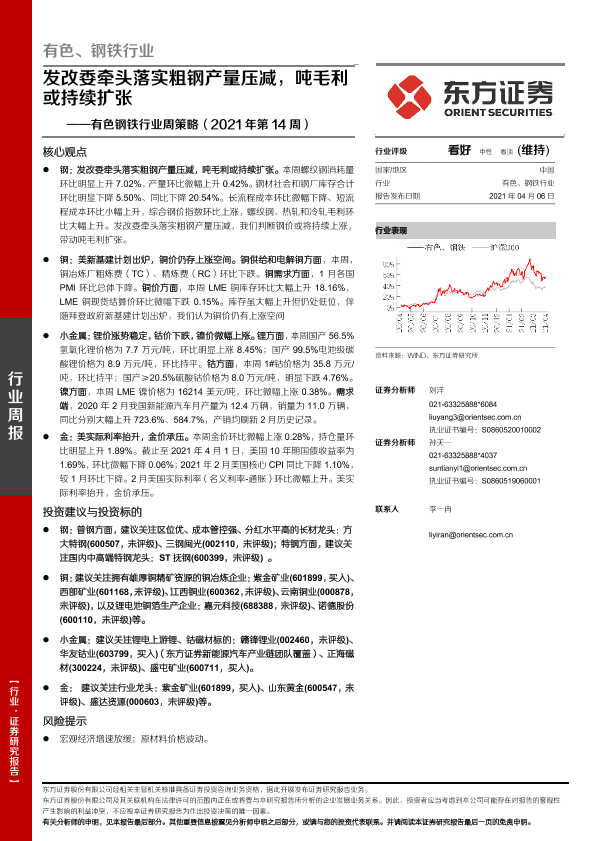 【东方证券】【20210406】有色钢铁行业周策略(2021年第14周):发改委牵头落实粗钢产量压减,吨毛利或持续扩张-27页