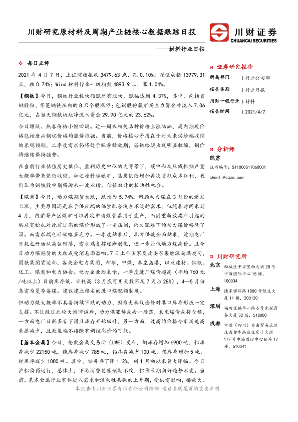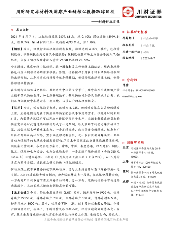 【川财证券】【20210407】材料行业日报:川财研究原材料及周期产业链核心数据跟踪日报-4页